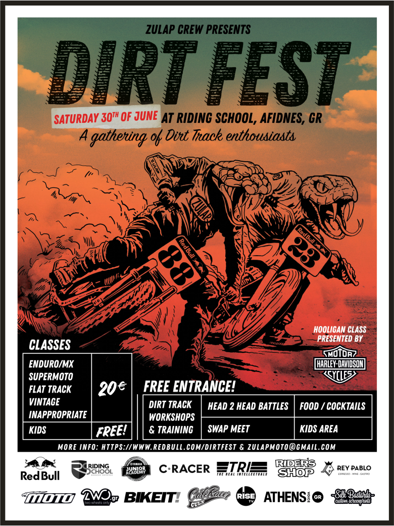 Με περισσότερες από 40 συμμετοχές και πλήθος φίλων & dirt track enthusiasts στο κοινό, η πρώτη έκδοση του DirtFest συγκεντρώνει ένα ανομοιογενές μείγμα αναβατών στην ανανεωμένη χωμάτινη οβάλ πίστα.